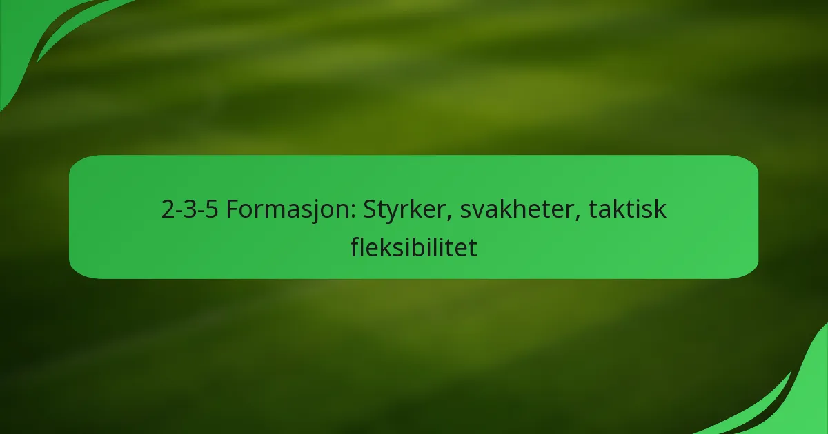 2-3-5-formasjonen er en klassisk fotballoppsett som har to forsvarsspillere, tre midtbanespillere og fem angrepsspillere, og legger vekt på offensivt spill og høy målscoringspotensial. Selv om den tillater flytende spillerbevegelser og effektiv utnyttelse av kantene, presenterer denne formasjonen også svakheter som defensive hull og utfordringer med å opprettholde kontrollen på midtbanen, noe som kan utnyttes av motstanderne.